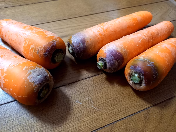 にんじんの色が濃くてジュースに最適です。さっぱりした飲み心地でおいしいです。煮物にも適しています。1キロ当たり6本ほど、平均150g〜200gの大小込みでお届けします。温度変化で表面に黒いシミのあるものや変形のものを集めた訳あり商品のためお安くなっています(黒いシミは表面だけなので皮をむくときれいなにんじんです)