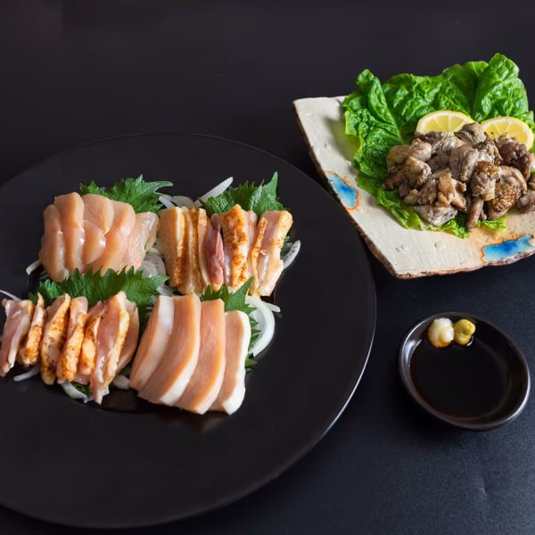 ▼自己紹介 鹿児島県の薩摩半島 南九州市知覧町で最大10kg迄育つ唯一無二の巨大ブランド鶏『さつま極鶏大摩桜(きわみどり だいまおう)』を1羽1羽、丁寧に愛情を込めて育てています。 長期独自肥育による肉の大きさ・弾力・旨味が特徴、キメ細い肉質で適度なサシ(霜降り)が特徴です。 鹿児島県の鶏刺し文化を大切に考え 農場内の処理場にて、鹿児島県生食用食鳥肉の衛生基準に基づいた最も安全と言われる 『吊り下げ式 外剥ぎ製法』により、 衛生・安全に努めています。 生産・加工・販売を全て自社で行っております。 ※県の衛生基準に基づき安全な処理を行っておりますが、一般的に食肉の生食は食中毒のリスクがあります。 ※お子様,ご高齢者様、食中毒に対する抵抗力の弱い人は食肉の生食は控えるようお願いいたします。 ▼商品概要 <大摩桜鶏刺し、炭火焼、オリジナル醤油付きセット> 定番の鶏刺し、摩桜の食感を最大限に味わえる大人気のムネ肉の厚切り刺し、しっとり口触りの上ささみ刺しと、ムネ肉と手羽をつないでいる希少部位ふりそでトロ刺し、大摩桜の鶏刺しが4種を各1Pずつ入った鶏刺しセット。 大摩桜ならではの鶏肉とは思えない食感で、新鮮で旨味の濃い美味しさが口いっぱいに広がります。 鶏肉とは思えない食感で、霜降りの美味しさが口いっぱいに広がります。 ▼品種・味の特徴・食べ方 【鶏刺し】 一番の食べ方はお刺身ですが、塩焼き、タレ焼き、湯引き、しゃぶしゃぶや柚子胡椒で炒めるのもおすすめです。 保存方法:冷凍(-18℃以下にて保存) ※解凍後当日中にお召し上がりください。 ※写真はイメージです。 【炭火焼】 解凍後、中身を取り出し容器に移し替え温めてお召し上がりください。(電子レンジ600W約1分) ※解凍後当日中にお召し上がりください。 ※写真はイメージです 【オリジナル醤油】 当店オリジナル甘口の鹿児島醤油。お刺身との相性抜群の甘めの味にニンニクの香りがふんわりと感じられ食欲をそそります。 ▼数量、分量の目安 内容 鶏刺し⇒160g×1パック 特選ムネ厚切り刺し⇒160g×1パック 上ささみ刺し⇒160g×1パック ふりそでトロ刺し⇒160g×1パック 炭火焼⇒125g×1パック オリジナル醤油⇒150ml×1本 ▼栽培/生産方法、こだわり 初生雛~出荷日齢まで、平飼いにて100日~150日以上の長期肥育を行います。トウモロコシを中心に鶏の日齢、体調を見て餌を与えます。全ての鶏に目が行き届く少量生産にて、一羽一羽の状態を確認しながら丁寧に手作業で育てています。効率よりも希少性と肉の美味しさを追求し、地鶏の日本農林規格である「1㎡あたり10羽」より2倍近く広い「1㎡あたり約5羽」 の放型鶏舎で、ゆったり、のびのびと育てています。 【発送につきまして】 ご希望のお届け日にご到着するための遅延防止といたしまして、発送日の翌日含む3~4日前に冷凍便にて発送いたしますのでご了承ください。 お届けご希望が無い場合は発送日より最短でのご到着となります。 ご不明な点につきましてはお問い合わせください。