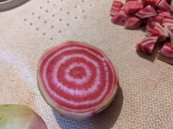 ③皮を剥いてお好みの用途に切り調理する。(※まな板と包丁が赤くなりますが洗えば落ちます。)