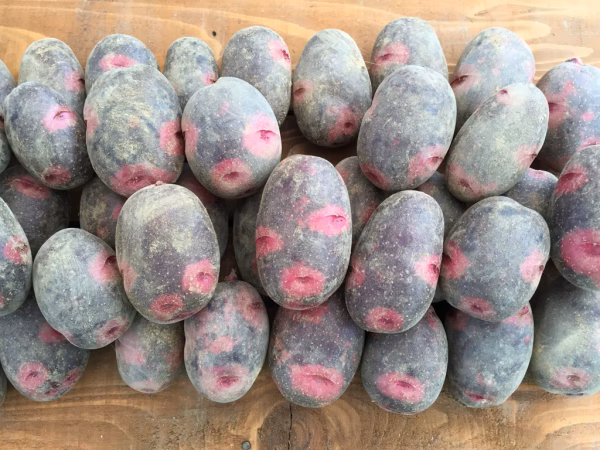 覆面レスラーに見えることから「デストロイヤー」とも呼ばれる。レッドムーンの変異株を、日本の民間が育種し登録されたそう。煮ては崩れにくく、焼いても揚げても火が通りやすい。大きさは、ふたくちサイズほどから、なるべく大きめまでお選びいただけます。用いた肥料は、ホタテ貝の粉末のみ(すぐの効果はおそらく見込めない)で、化学肥料・農薬は使用していません。