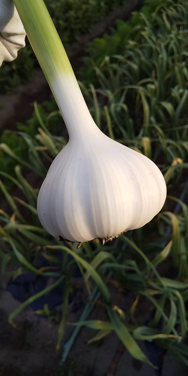 一年でいまの時期にしか味わえない「生にんにく」。品種は福地ホワイト六片系の『白玉王(しらたまおう)』です。