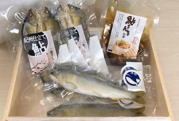 お世話になっている方へ 季節のご挨拶に感謝の気持ちを込めて。 和歌山県産のブランド鮎 “紀州仕立て鮎”のプレミアムギフトです。 ※ご自宅用、贈答用、どちらでもご注文可能です。(ご自宅用の場合は包装なし) ※熨斗、名入れ対応可。ご希望の場合は申し送り事項に記載をお願いいたし ます。(内熨斗包装でのご対応となります) ★商品の特徴★ ■紀州仕立て鮎『凍眠』大サイズ とってもジューシーで、次々と頬張りたくなる鮎です。 定番の塩焼きはもちろんのこと、鮎そうめんやお刺身でも・・・。 ※急速冷凍「凍眠」で冷凍しているので、お刺身でも美味しくいただけます。 ■『鮎一夜干し”梅仕立て”』中サイズ 自慢の「紀州仕立て鮎」を丁寧にひらき、和歌山名産の梅酢に浸けて、じっくりと乾燥させました。ほんのり香る梅の風味と鮎本来のうまみがマッチングした究極の逸品です。 頭から尾っぽまで、丸ごと食べやすい鮎一夜干しです。 ■『鮎まんまの素』2合炊き じっくり焼き上げた、自慢の「紀州仕立て鮎」をほぐし、醤油などの調味料を加えてお米と合わさるように試行錯誤し、見事な味に仕上げました。 炊飯器でお米・水と一緒に炊き上げるだけ。 大人気、ほっくほくの炊き込みご飯の素です。 ★おいしい食べ方★ 紀州仕立て鮎『凍眠』 冷蔵庫で自然解凍、又は、流水で溶かしてください。 定番の塩焼きはもちろんのこと、鮎そうめんやお刺身にも。 『鮎一夜干し”梅仕立て”』 冷凍状態のまま、袋から取り出しトースター等で焦げ目がつくまで焼いてください。 ※参考:1000Wトースターで3〜4分。 『鮎まんまの素』 本品1パックを2合のお米と一緒に炊飯器に入れ、水を2合炊きの線に合わせ、炊くだけ! ★商品内容・原材料★ 商品内容:紀州仕立て鮎『凍眠』大サイズ 商品内容:『鮎一夜干し”梅仕立て”』中サイズ 原材料:鮎、梅酢 ※無添加 商品内容:『鮎まんまの素』2合炊き用 原材料:鮎(子持ち鮎を含む)、塩、醤油、みりん、昆布粉末 ※無添加 ★生産方法のこだわり★ 鮎を育てる環境で、一番大事なのは水。当社では、天然の伏流水をふんだんに汲み上げ、より自然に近い環境を飼育池で整え、よく食べてよく運動する肉質の良い鮎を育てています。 ★注文に際しての注意点(配送方法や納期指定など)★ ※このセット商品は、冷凍便でお届けになります。商品到着後、『鮎まんまの素』は、冷蔵庫にて解凍をお願いします。 ※ご注文をいただいてからご用意いたしますので、発送までに2~3日いただいております。 ※お届け日指定可能です。お気軽にご相談ください。 ※発送は、月曜日・火曜日・水曜日・木曜日・金曜日となります。