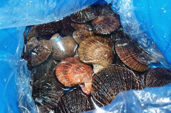 ○殺菌海水を充填し 殻付き赤皿貝を梱包することで、