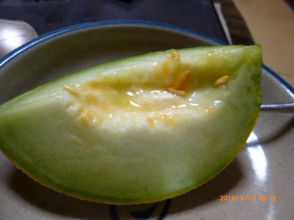 表面が黄色く変色を始めた頃が収穫期で、食べ頃は、表面が黄色くなって底などが少し柔らかくなってきてからです。カット前から爽やかな甘い香りが漂ってきて、熟した後は、柔らかく爽やかな香りで何とも言えない食感です。