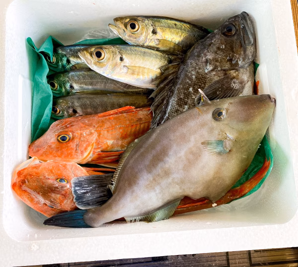 マアジ、カナガシラ、クロソイ、オニオコゼなどのその時に獲れたお魚を3〜5種類を組み合わせて梱包します。