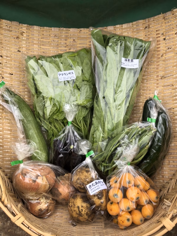 きゅうり、ズッキーニ、いんげん、じゃがいもキタアカリ、玉ねぎ、バジル、アマランサス、油麦菜、茄子、ビワの10品です。
