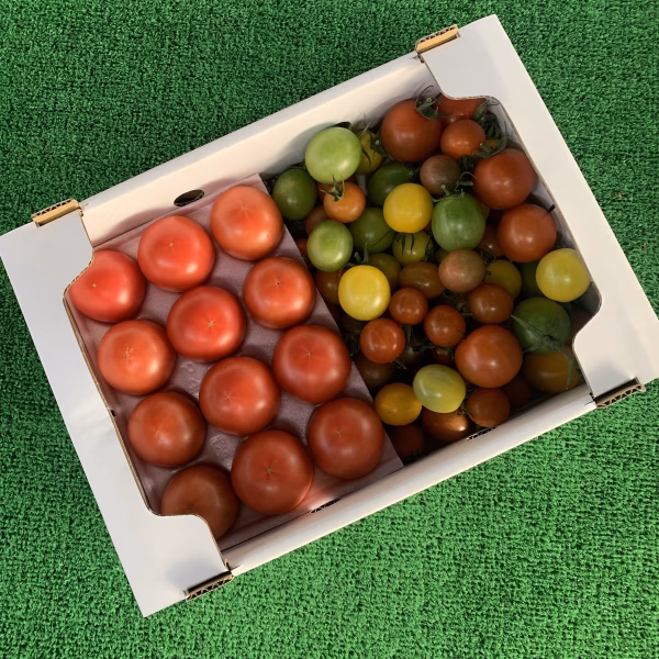 ✨今だけ全国一律送料1000円✨3/24まで トマトは収穫(獲高により入らない品種もあり)により7種以上の物が入っており、それぞれの味を是非食べ比べしてみて下さい♪ 簡単に説明すると、 セレブスイート …中大玉サイズの濃厚なトマト。 …10〜12玉入り、約750〜850g フルティカ   …フルティカは安定した中玉トマトは人気。 オレンジルル  …その名の通り柑橘系の味わいがあります。 甘ちゃん黄色  …鮮やかなレモン色でトマトの風味が高い。 トスカーナバイオレット         …葡萄をイメージして作られた芳醇な香り。 グリーン114   …見た目と味のギャップが凄い、甘いです。 千果      …ミニトマトの中でも味が濃いです。 サンピーター  …楕円形のフルーティーなトマト。 上記6〜7種(収穫により取れない品種があります)を約750〜850g