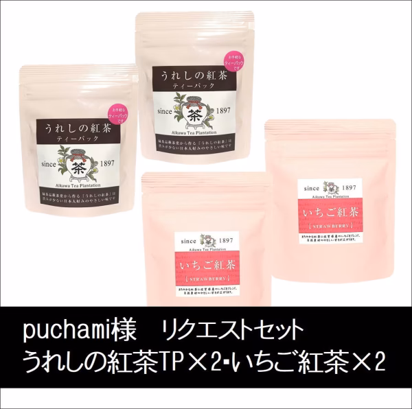 - 【品名】いちご紅茶【名称】ブレンドティー 【原材料】紅茶・いちご 【原産地】紅茶(佐賀県嬉野市産)いちご(佐賀県産)【内容量】30g【賞味期限】365日 【製造者】相川製茶舗 代表者 相川源太郎 佐賀県嬉野市嬉野町大字下宿甲4002-1 TEL:0954-42-1756【品名】うれしの紅茶【名称】紅茶ティーパック 【原材料】紅茶 【原産地】佐賀県嬉野市産【内容量】24g(2g×12)【賞味期限】365日 【製造者】相川製茶舗 代表者 相川源太郎 佐賀県嬉野市嬉野町大字下宿甲4002-1 TEL:0954-42-17