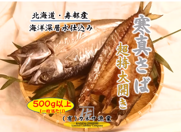 - 名 称:超特大寒マサバの開き 原材料:マサバ、海洋深層水 内容量:1pc 2枚入り 賞味期限:欄外に記載 製造者:㈲カネサ漁業 販売者:㈲カネサ漁業 連絡先:北海道寿都郡寿都町字歌棄町美谷237-11