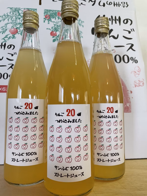2021年11月に収穫された、サンふじりんごで出来たジュースです。もちろん当農園のりんごだけを使った贅沢な100%ストレート果汁です。