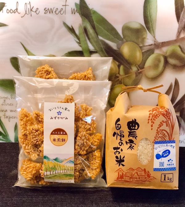 今回 地元のお土産に!と当園減農薬栽培みずかがみ一等米と こだわりの信州産丸大豆醤油を贅沢に使用した米煎餅を発売しました。