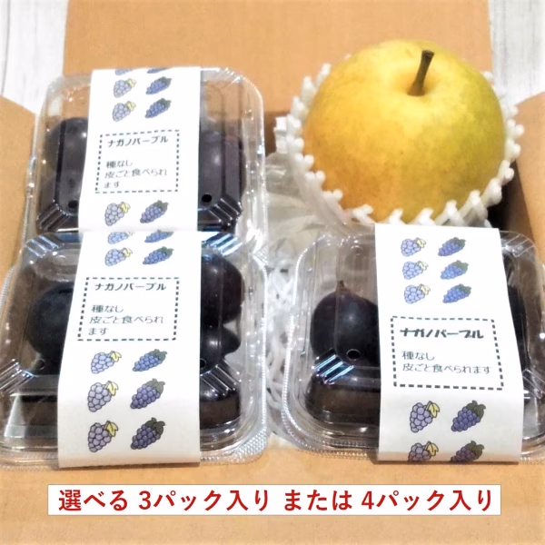 種無しで皮ごと食べられるナガノパープル粒パックと季節の梨またはりんご1個とです