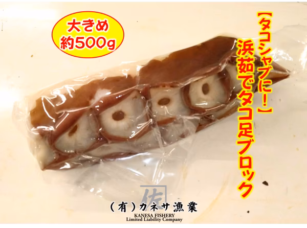 - 名 称:タコ足ブロック 原材料:水たこ(寿都産)、塩 内容量:1個 製造者:㈲カネサ漁業 販売者:㈲カネサ漁業 連絡先:北海道寿都郡寿都町字歌棄町美谷237-11