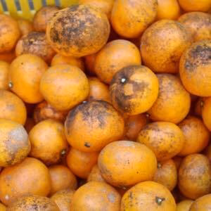 害虫の影響で果皮にスス(煤煙や黒カビではありません)がついていまが洗えば落ちます。