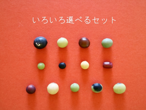 ●青大豆ミックス・・・色や大きさの違う5種類の青大豆のミックスです。サラダや豆ご飯にオススメです。水戻しをする前と後、火を入れた後、少しずつ変わる色合いもお楽しみください。