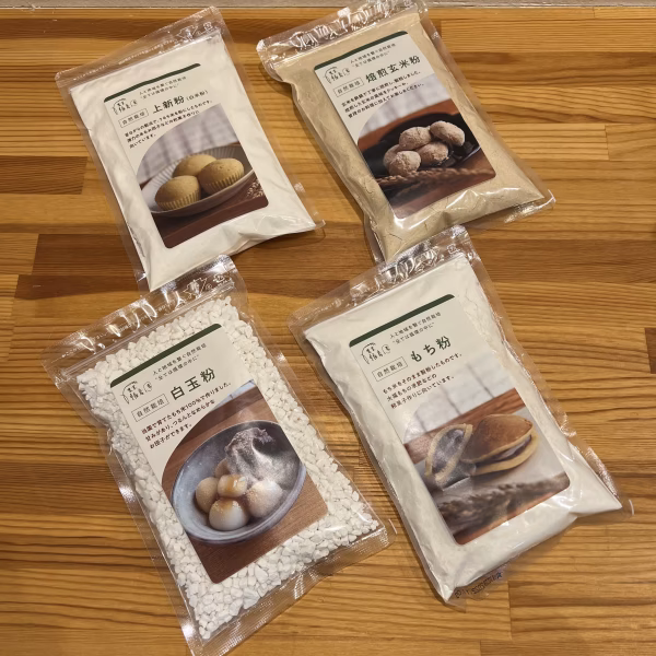 こちらは、【白米粉(上新粉)・焙煎玄米粉・もち粉・国産白玉粉】の中から2種類選べるセットとなっております。