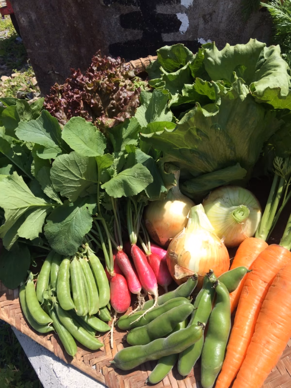 人参、新玉ねぎ、ソラマメ、スナップえんどう、レタス、サニーレタス、ラデッシュ、わさび菜、小松菜、ルッコラ、紫水菜、じゃがいも、きゅうりなどから10品梱包するお任せです。何が入っているかはお楽しみ〜〜‼︎