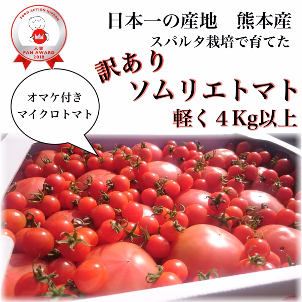 ご覧頂きありがとうございます。 日本一のトマトの産地熊本県より、手間を惜しまず大切に育てたトマトをお届け致します。 午前中に収穫したトマトを午後に発送するため新鮮そのもの ちぎりたてをすぐに箱詰めしているので 箱を開けるとトマト畑にきたような匂いが感じられます。 トマトで笑顔の食卓を囲んで頂きたいという思いで楽しく農作業をしている農家からの お届けものです。 <ソムリエトマト> 皮が薄く酸味が少ない大玉のトマトです。 <商品内容> 品種は『麗容』です。 この商品にはオマケが付きます。 オマケは3種類あります ①マイクロトマト ②希少な高濃度フルーツトマト ③酸味が少ないフルーツトマト ※この商品のオマケは①です ※収穫の量やタイミングによってオマケが他の種類に変わってしまうことがあります。ご了承の上お買い求め下さい。 オマケについて マイクロトマトはとっても小さいのに しっかりとトマトの味がする何とも可愛らしいトマトです。 ① 80サイズの箱にパンパンにトマトを箱詰めしマイクロトマト300g(60玉~100玉)を丁寧に袋に入れて発送いたします ②60サイズの箱にパンパンにトマトを箱詰めし酸味が少ないフルーツトマト150g(30玉~50玉)を隙間にのせて発送いたします 2種類のトマトをお楽しみください。 <受賞歴> ソムリエトマトは、2017年野菜ソムリエサミットで2回連続銀賞を受賞しました。 2018年農林水産省のフード・アクション・ニッポンアワードで100選に入賞しました。 <栽培のこだわり> ~生きるか枯れるかのスパルタな栽培~ 苗を植える前に栄養たっぷりにした土壌をガチガチにローラーで固めます。マルチングを被せ穴を1個1個ドリルでドドドッと開けて苗を植えることで、苗が水を求め硬い土を打ち砕きながら張り巡ります。強い根を作る事でより多くの水と栄養を取り入れる事が出来るようになりトマトのおいしさにつながります。 <産地の特徴> ~熊本県はトマトの生産日本一!!~ 熊本県は、きれいな湧き水がたくさんあり水道水もごくごくと飲めるほどおいしい水です。 また有明海に面しており、ミネラルをたっぷり含んだ土と温暖な気候がトマトの成長に最も適している場所なので熊本県は日本一の生産地となっています。 ハウスの横の用水路には沢山のシジミ貝が育ちます。 調べてみたら、塩分を含んだ綺麗な水でシジミ貝は育つそうです。 そんな水で育ったトマトは、間違えなく美味! <エコファーマー取得だから安心!!> エコファーマーとは、化学肥料を30%以上減らし化学合成、農薬も減らす計画に基づいて作られます。 県知事の認定を受けた計画に基づき、土づくり減化学肥料、減化学農薬などの持続性の高い農業に取り組みます。 <残留農薬0だから安心!!> 検査料が高額なため、なかなか検査をしている農家さんはいませんが、大切なお客様に安心して美味しくトマトを食べて健康に過ごして頂きたいという思いで定期的に残留農薬検査をしています。 自身を持って安全なトマトだと宣言します! <注意> ● 60サイズは2kg超えると80サイズになるため 総重量2kg以内で発送致します。 80サイズは5kg超えると100サイズになるため 総重量5kg以内で発送致します。 ● 収穫のタイミングがあるため日にち指定は出来ませんが、時間指定承ります。 ご希望の方はお気軽にお申し付け下さい。 ★午前中 ★14時〜16時 ★16時〜18時 ★18時〜20時 ★19時〜21時 ●発送前には全てのトマトのを検品しますが輸送の際揺れや衝撃によりどうしても多少の裂果や潰れが出てしまう可能性があります ●暑い時期トマトは青い状態で発送いたします トマトは追熟してだんだん美味しくなりますので、 常温で保存をお勧め致します。 冷蔵庫に入れると美味しさが急速に失われますのでご注意ください。 1日、2日で赤くなりますので赤くなったトマトからお召し上がりください。 ●5月からはクール便での発送を推奨しております。トラブル防止のためにご協力を宜しくお願い致します。