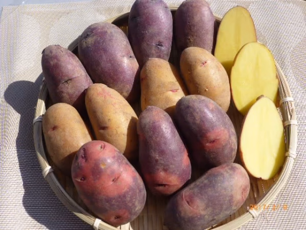 この3品種を化学肥料不使用・農薬不使用で、完熟堆肥や有機質肥料やカツオ由来の肥料、ミネラルを与えて栽培しました。この3種は皮の色味が違いますが、元を辿ると同じ品種からの突然変異であり、味や食感も違いが楽しめます(^o^)