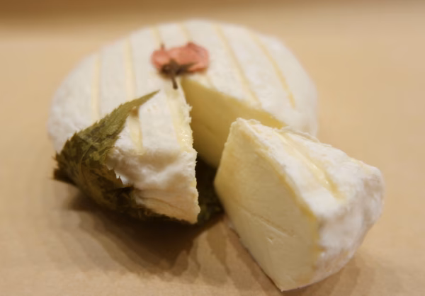 当舎のプチ・プレジールという、手のひらサイズのソフトタイプのチーズに桜の葉で香りをつけ、日本独自の微生物の力を借りるために日本酒の酒粕も入れております。十勝のエゾヤマザクラから取れた酵母も使用しています。和風のチーズの味わいを是非お楽しみください。