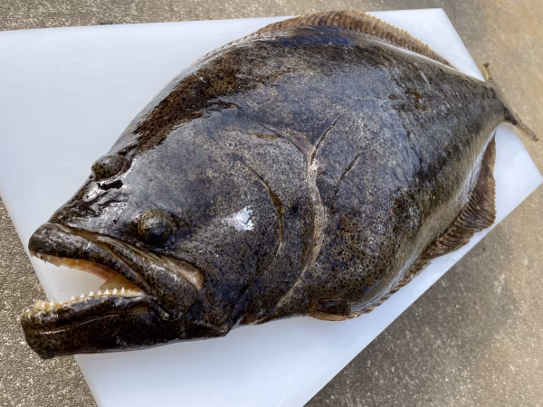 今朝の素潜り漁で海に潜り銛で一発で仕留めたヒラメです。身を傷つけないよう頭を狙って突きました。