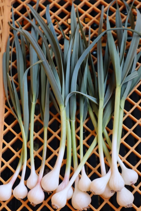 1.にんにくとの違い⇒葉も食べられる専用種です。②にんにくと違いに匂わないのでは?という意見も ③見た目は小ネギです。通常のにんにくより五か月も栽培期間が短く出来るので、農薬回数を少なく出来るのが特徴です。