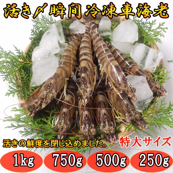 水揚げしたその日に、一級品の大サイズのみを厳選し、活きの鮮度を閉じ込めた、急速冷凍を超える活きの鮮度とほとんど変わらない冷凍技術、瞬間冷凍の車海老です。
