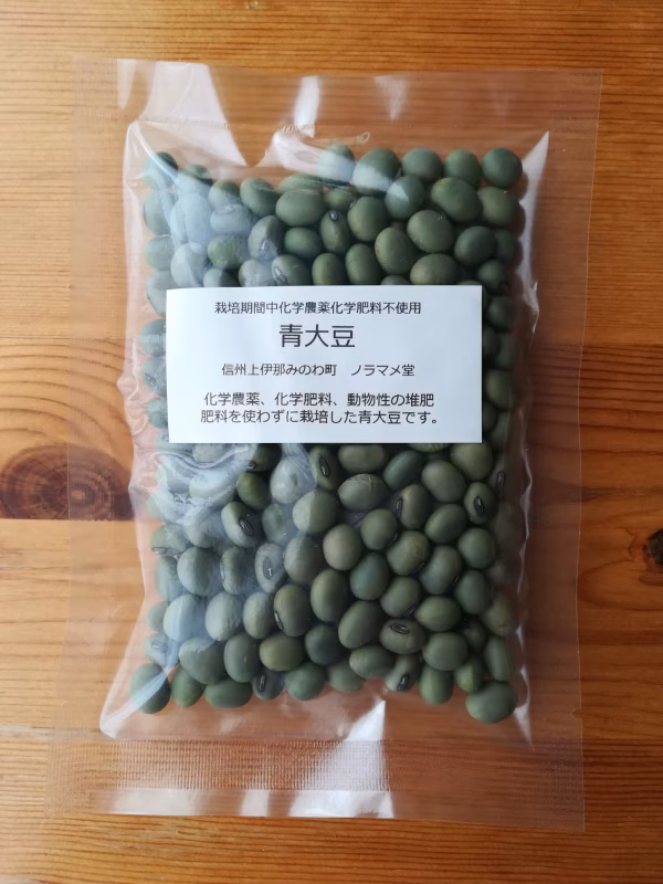 化学農薬、化学肥料、動物性の堆肥、肥料を使わずに栽培した2021産大豆3種、青大豆、鞍掛豆、黒大豆です。それぞれ100gずつのお試しサイズです。是非食べ比べしてみてください。