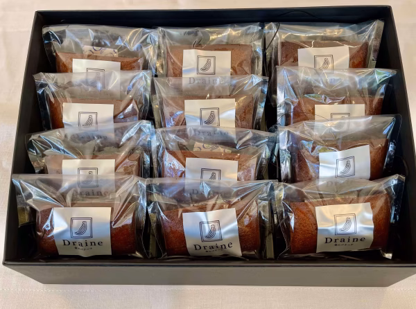このフィナンシェは、こだわりの技術を用いて丁寧に栽培された金のバナーナDraineを皮ごと使用し、国産発酵バターと共にしっとり焼き上げています。