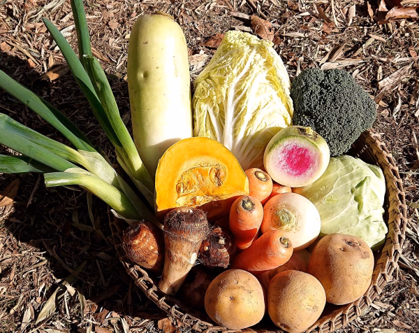 おふくろ大根、紅芯大根、赤大根、聖護院大根、下仁田ねぎ、赤ネギ、かぼちゃ、里芋、かぶ、聖護院かぶ、キクイモ、じゃがいも、人参、白菜、ヤーコン、ポップコーンなど