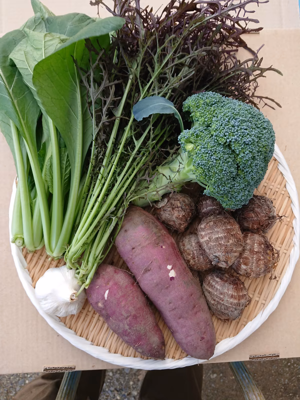 福井県産 農薬不使用 野菜セット ※ 画像はイメージです。収穫状況により変更します。 6~8品種 80サイズ 基本は注文後収穫です。 さつまいも 里芋 ニンニク ブロッコリー カリフラワー ロマネスコ コマツナ からし菜 白菜 大根 人参 水菜 など 目標は幸せを作ること  地球との共存共栄 多品種少量生産 農薬不使用 ※ 農薬不使用のため虫食い穴がある場合があります。   一人農業のためご迷惑をかける場合があります。ご了承ください。