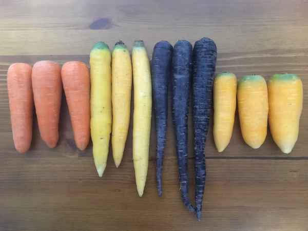 人参4種類をセットでお送りします。 (写真は各500gです。サイズにより本数は多少増減します。) ・オレンジ(一般的な人参) ・イエロー人参 ・パープル人参 ・金美人参 イエロー人参とパープル人参は、生でサラダやグリル・ソテー、ジュースなど 使い方は様々。 金美人参は甘みがあり、生で食べるのがおすすめです。人参臭さがなく、味もオレンジの人参とは違うので、人参が苦手な方でも食べられます。