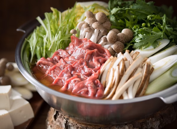 筋肉の張りと、しなやかさを感じられる躍動的な肉質が特徴のシンタマの旨味とご一緒に、鹿だし鍋をお楽しみください。