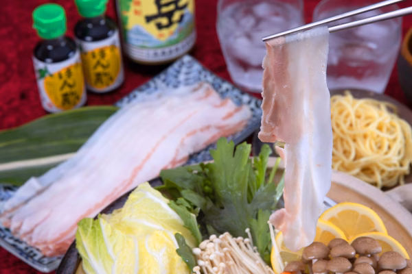 沸騰しないギリギリの温度でじっくりしゃぶしゃぶして頂くと美味しくお召し上がりいただけます。鹿児島伝統の黒豚をぜひご賞味ください。