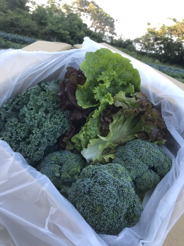 ケール200g分、ブロッコリー6個、レタス4種200g分が入ってます。