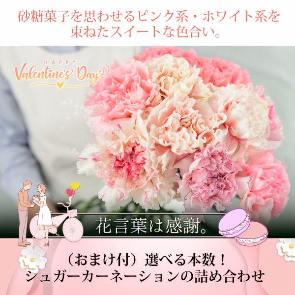 ★ヨーロッパでは、バレンタインデーに花を贈る風習があります。友達や家族、 恋人に色とりどりの花を詰め合わせした花束を贈ります。「自分用」に買いたいご褒美カーネーションにもおすすめです。