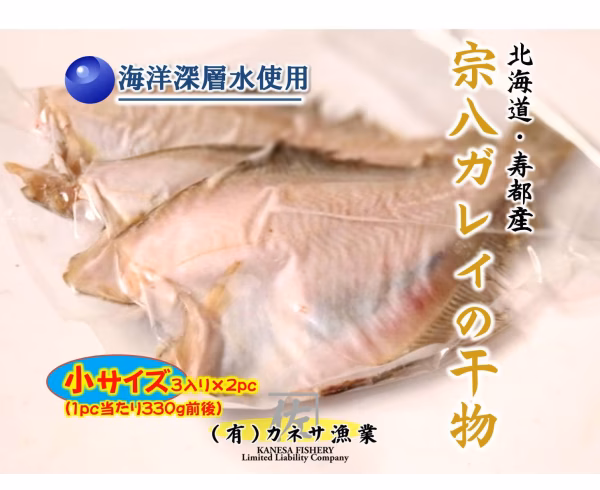 - 名 称 :宗八ガレイの干物 原材料 :宗八ガレイ(寿都産)、海洋深層水 内容量 :3枚入×2pc 製造者 :(有)カネサ漁業 販売者 :(有)カネサ漁業 連絡先 :北海道寿都郡寿都町字美谷237-11
