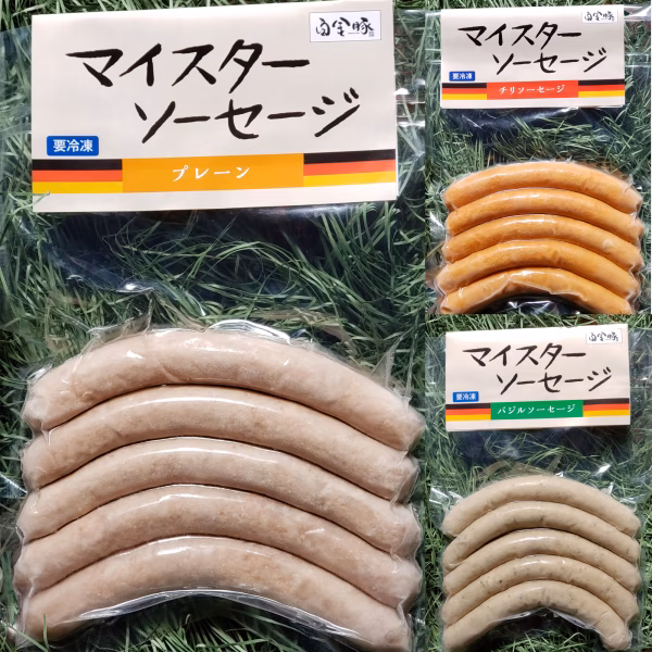 白金豚のマイスターソーセージ3種セット。福袋で大好評だった商品が決算セールでも登場です。白金豚の粗挽き(モモ・ウデ)をふんだんに使用。お肉の味のしっかり残った、上品味のてづくりソーセージです。