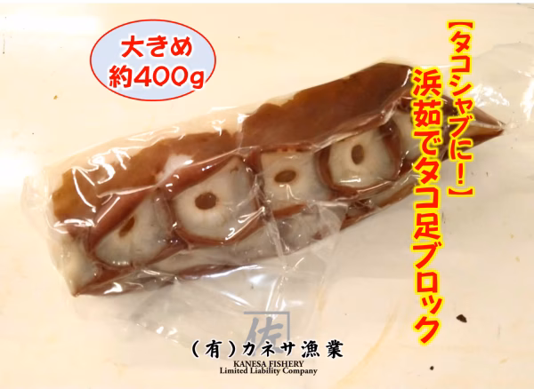 - 名 称:タコ足ブロック 原材料:水たこ(寿都産)、塩 内容量:1個 製造者:㈲カネサ漁業 販売者:㈲カネサ漁業 連絡先:北海道寿都郡寿都町字歌棄町美谷237-11