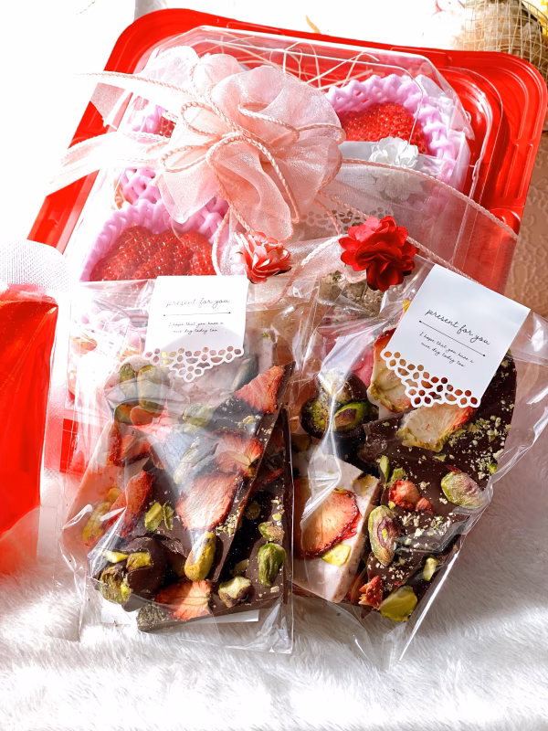 苺農家が作る、苺100%のドライ苺とドライ苺パウダーをたっぷり散りばめた苺とピスタチオのチョコ。