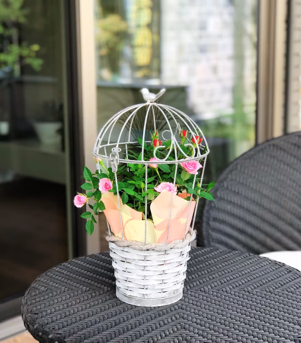北欧スタイルおしゃれな雰囲気が漂っているグレーに白色をコーディネイトした紐で巻いた鳥かごのようなバスケットに中輪形のコルダーナローズ2色が植えてあります。ローズのバードソングです♪♪♪