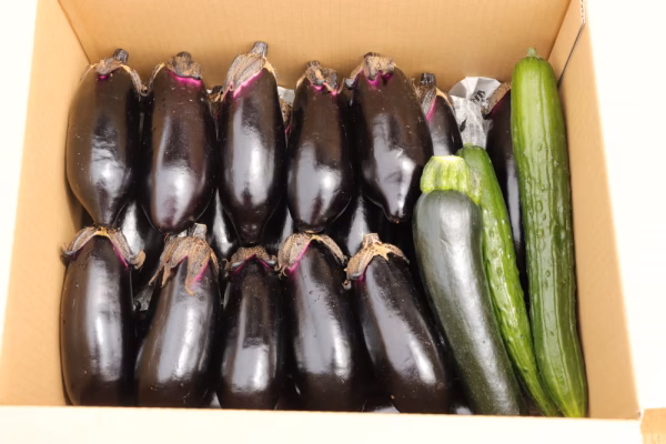 セット内容には、旬ナスの他に、その日に採れた野菜(キュウリ、ズッキーニ、等 (注))も、箱に入るだけサービスいたします☆