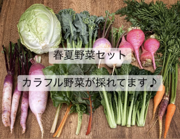葉付き人参、カラフル大根、カラフルかぶ、キャベツ、イボきゅうり、ズッキーニ2色、紫水菜、水菜、フリルレタス、茎ブロッコリー、白菜菜、赤からし菜、ルッコラ、トレビス、エンサイ、つるむらさき、モロヘイヤ、とうもろこしなど