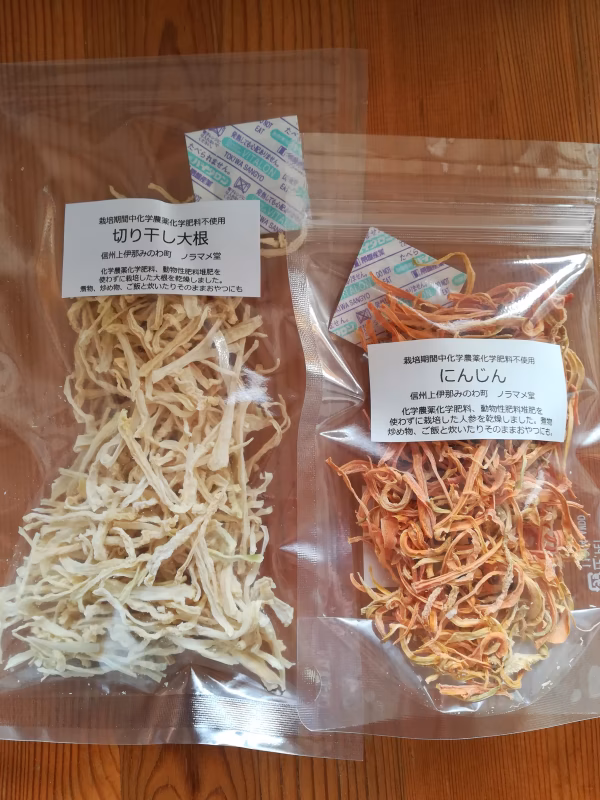 化学農薬、化学肥料、動物性の堆肥、肥料を使わずに栽培した人参、大根を切り干しにしました。