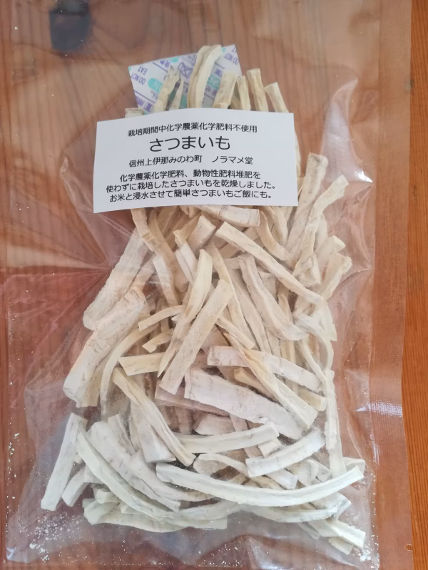 化学農薬、化学肥料、動物性の肥料堆肥を使わずに栽培したさつまいもを手軽に食べられるよう、火が通りやすいようカットして乾燥させました(いわゆる「干し芋」ではありません)。8分ほど茹でて煮物やスープに。お米と一緒に浸水させて炊いて「さつまいもご飯」にも。