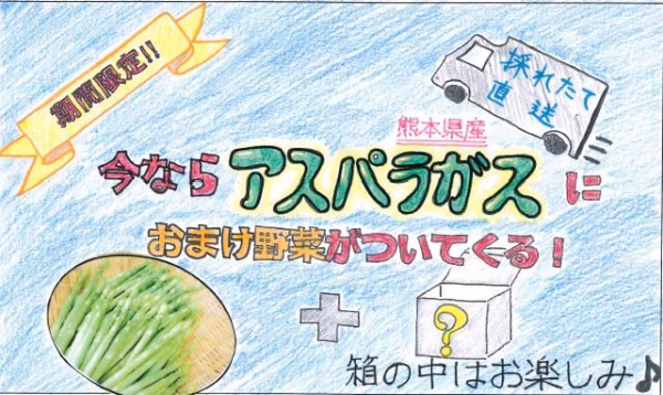 熊本県益城町で採れた自社栽培のアスパラガスにおまけお野菜を詰めこんだセットになります!