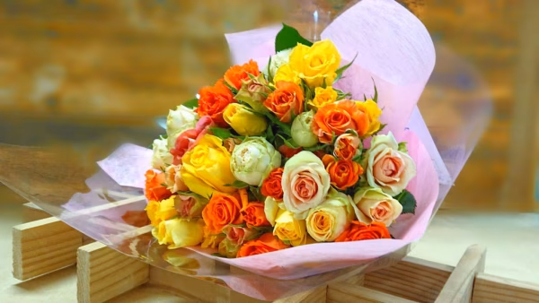 制作日に揃ったバラから厳選した黄オレンジ系の組み合わせで高さ40cm(80サイズ)の箱でお届け致します。