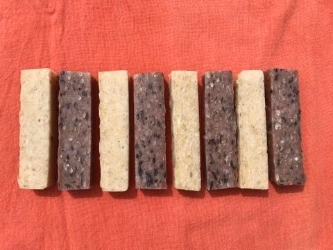 プレーンタイプの玄米餅と黒米入り玄米餅を片手でつまめる棒状にカットしました。