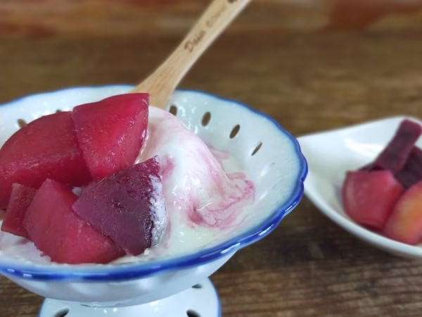 サツマイモのバニラピクルスはなんといってもバニラアイスとの組み合わせが最高です。もちろんそのまま召し上がっていただいても立派なデザートになります。