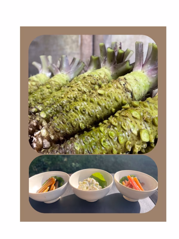 ○真妻わさび・・・山葵には品種が数十種類以上もありその中でも最高峰として名高い品種が「真妻(まづま)山葵」です。